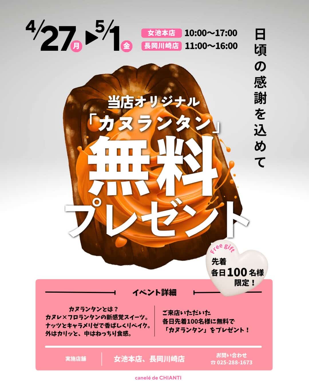 実施店舗は「カヌレドキャンティ長岡川崎店」と「カヌレドキャンティ女池本店」です。ちなみに「カヌレドキャンティ長岡川崎店」は2026年4月28日(火)がお休みとなります。